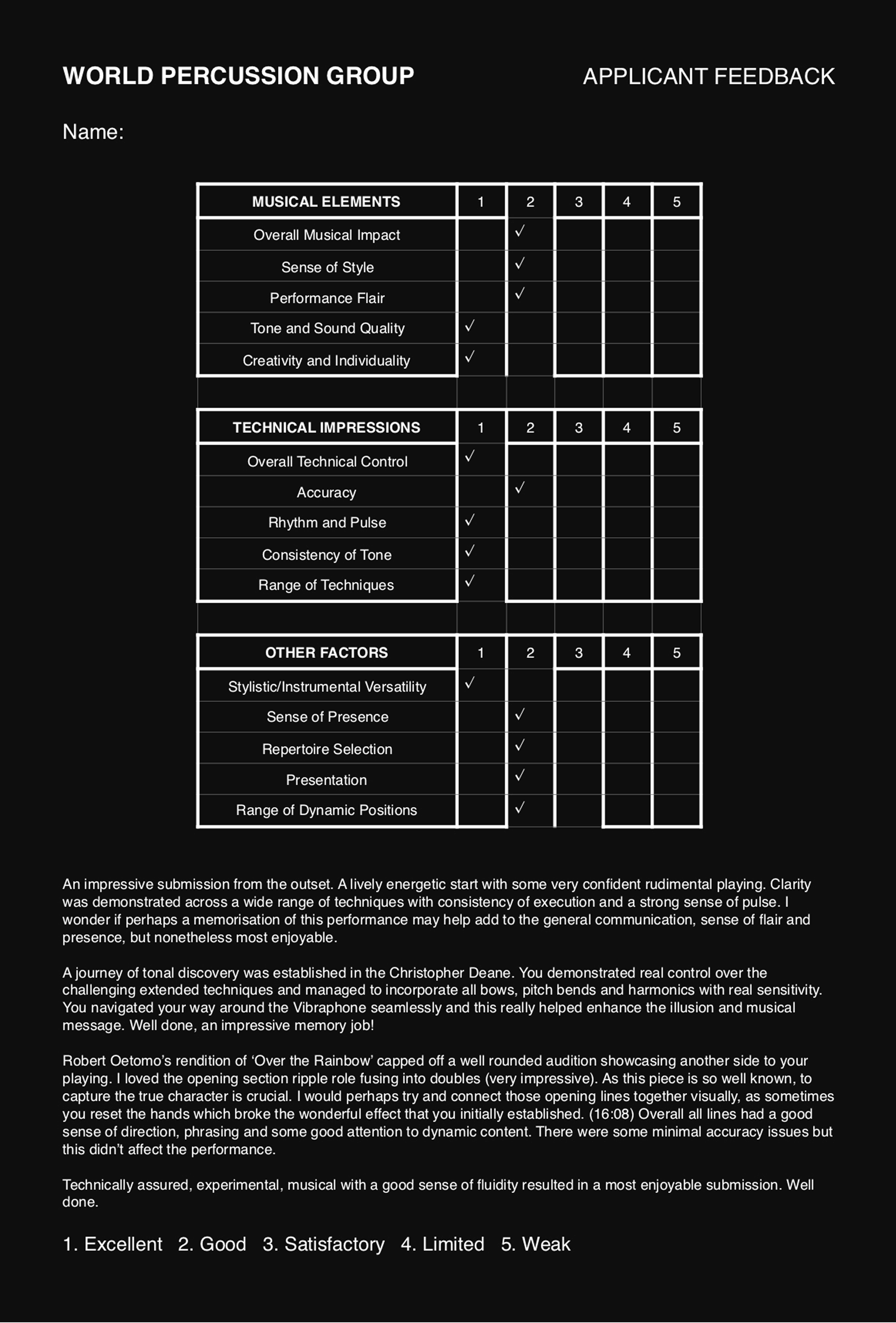 You can watch the video once you register to see how the official audition excerpts are performed live by Maraca2. The audition pack and backing tracks will become available to download after registration. All submissions will be assessed using consistent and detailed evaluation criteria. Every applicant will receive feedback from WPG Artistic Director Tim Palmer, offering insight into the selection process and decisions. An example is available below.